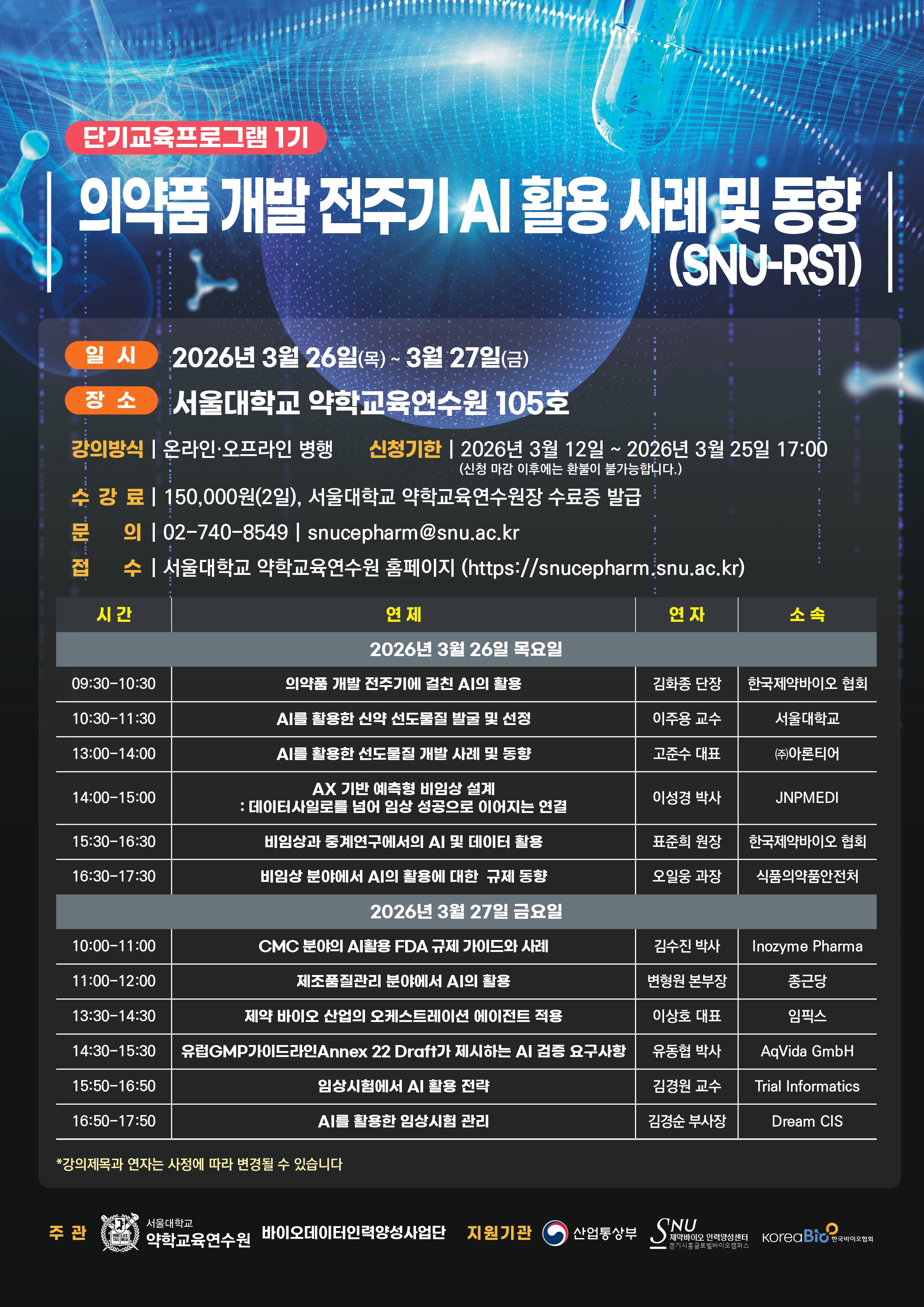 서울대학교 약학교육연수원에서 '의약품 개발 전주기 AI활용 사례 및 동향'을 주제로 단기 교육프로그램을 개최합니다.